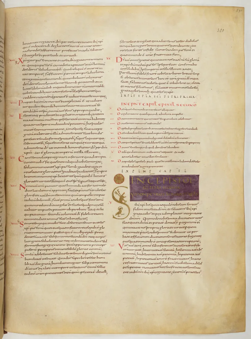 Folio 767 of the First Bible of Charles the Bald, an extant Carolingian Vulgate manuscript from the Tours scriptorium (c. 845). Approximately corresponds to 2 Corinthians 9 in Vulgate book order. The folio shows the actual ninth-century Latin text and decoration as it would have been read in the Carolingian court.