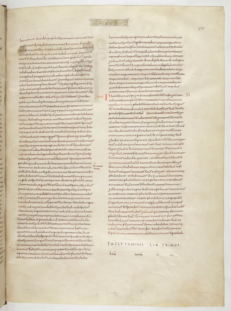 Folio 209 of the First Bible of Charles the Bald, an extant Carolingian Vulgate manuscript from the Tours scriptorium (c. 845). Approximately corresponds to 2 Kings 10 in Vulgate book order. The folio shows the actual ninth-century Latin text and decoration as it would have been read in the Carolingian court.