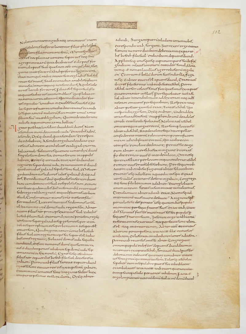 Folio 211 of the First Bible of Charles the Bald, an extant Carolingian Vulgate manuscript from the Tours scriptorium (c. 845). Approximately corresponds to 2 Kings 12 in Vulgate book order. The folio shows the actual ninth-century Latin text and decoration as it would have been read in the Carolingian court.