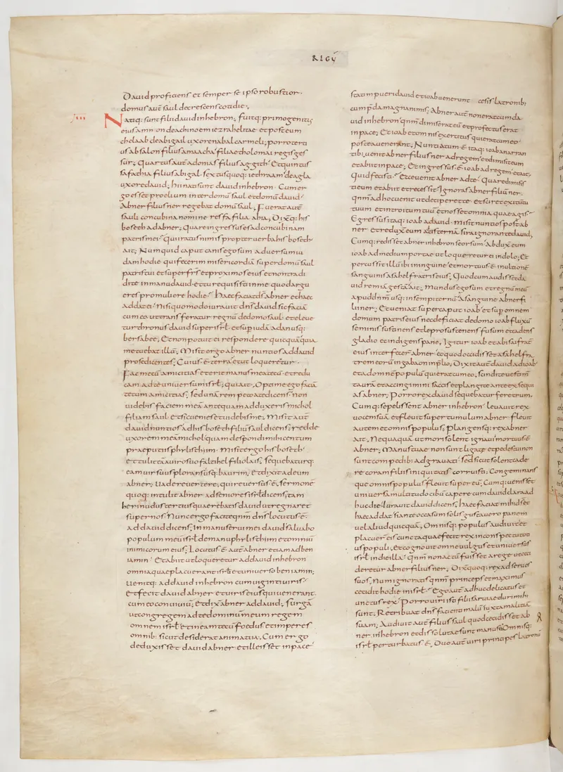 Folio 212 of the First Bible of Charles the Bald, an extant Carolingian Vulgate manuscript from the Tours scriptorium (c. 845). Approximately corresponds to 2 Kings 15 in Vulgate book order. The folio shows the actual ninth-century Latin text and decoration as it would have been read in the Carolingian court.