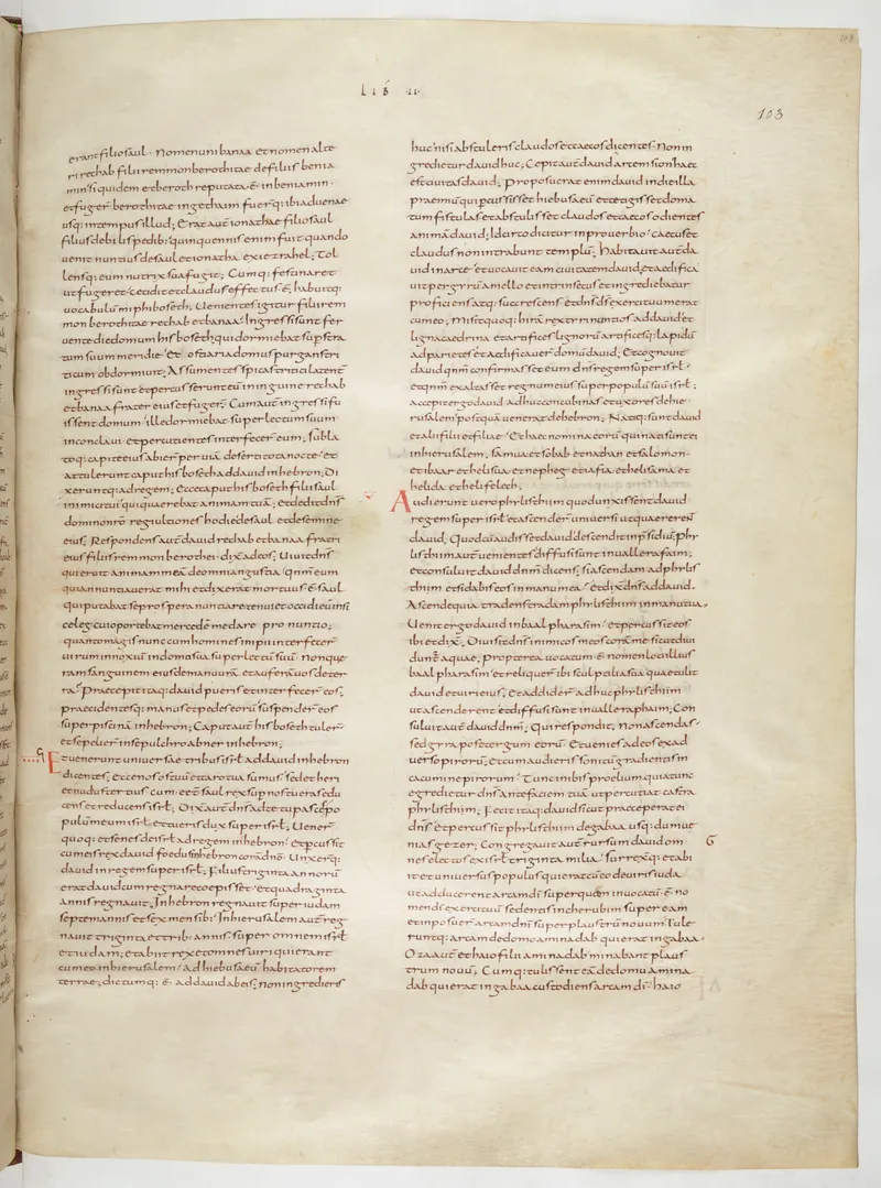 Folio 213 of the First Bible of Charles the Bald, an extant Carolingian Vulgate manuscript from the Tours scriptorium (c. 845). Approximately corresponds to 2 Kings 16 in Vulgate book order. The folio shows the actual ninth-century Latin text and decoration as it would have been read in the Carolingian court.