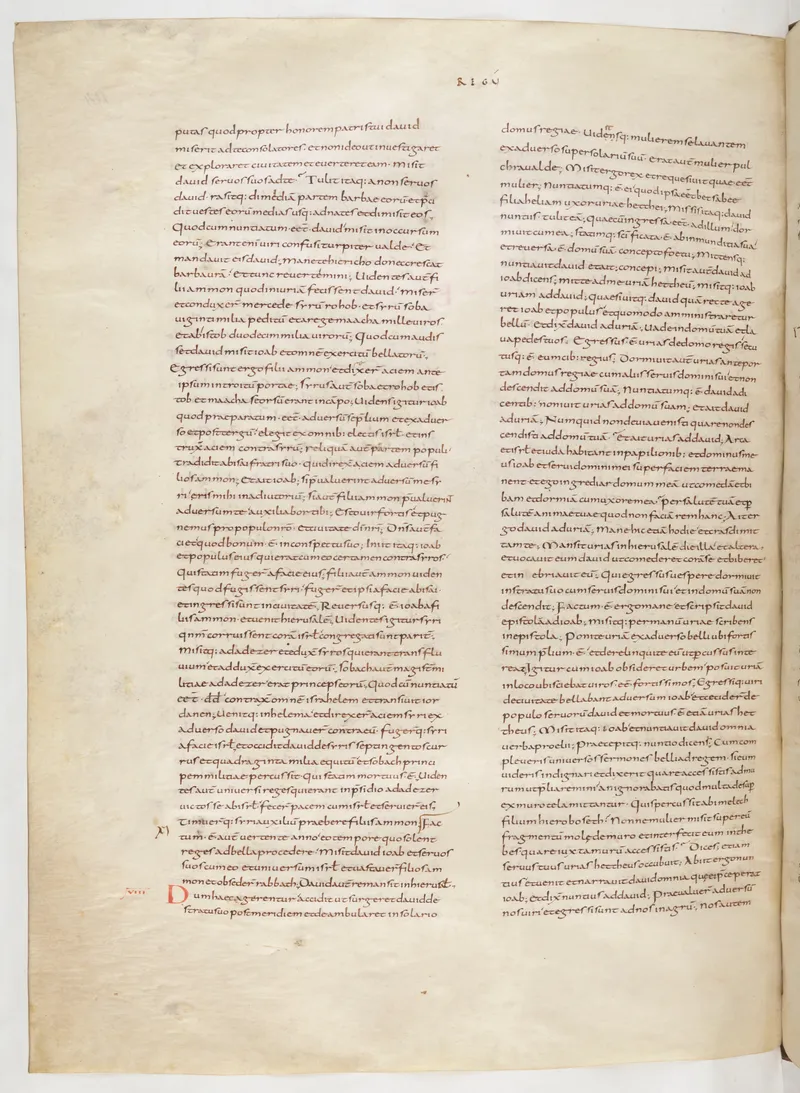 Folio 216 of the First Bible of Charles the Bald, an extant Carolingian Vulgate manuscript from the Tours scriptorium (c. 845). Approximately corresponds to 2 Kings 21 in Vulgate book order. The folio shows the actual ninth-century Latin text and decoration as it would have been read in the Carolingian court.