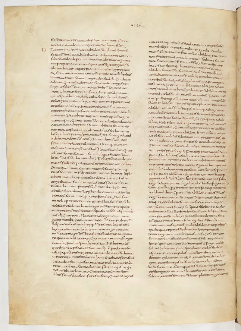 Folio 218 of the First Bible of Charles the Bald, an extant Carolingian Vulgate manuscript from the Tours scriptorium (c. 845). Approximately corresponds to 2 Kings 24 in Vulgate book order. The folio shows the actual ninth-century Latin text and decoration as it would have been read in the Carolingian court.