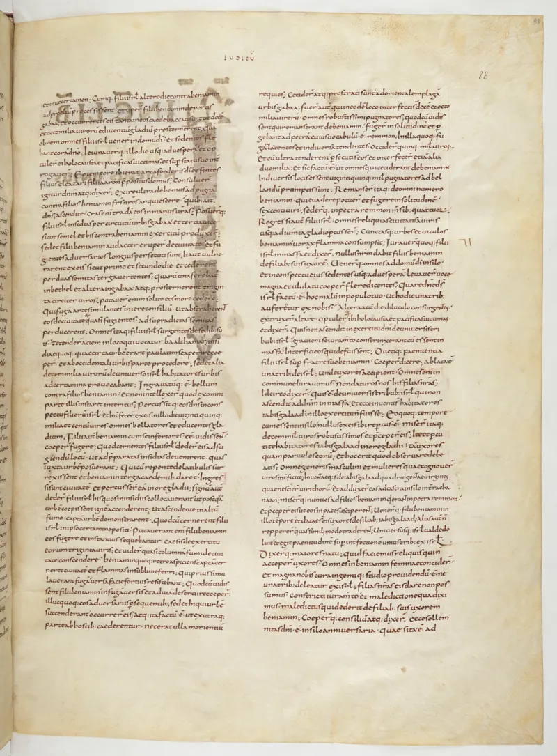 Folio 183 of the First Bible of Charles the Bald, an extant Carolingian Vulgate manuscript from the Tours scriptorium (c. 845). Approximately corresponds to 2 Samuel 13 in Vulgate book order. The folio shows the actual ninth-century Latin text and decoration as it would have been read in the Carolingian court.