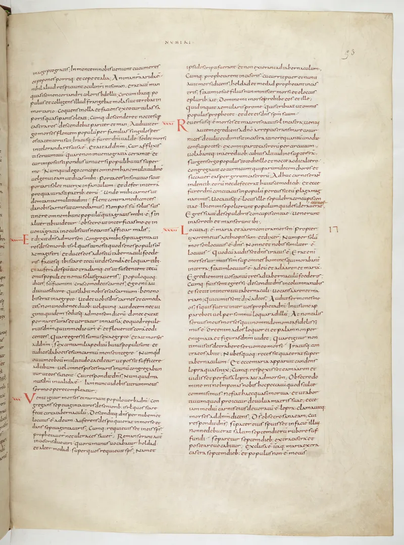 Folio 113 of the First Bible of Charles the Bald, an extant Carolingian Vulgate manuscript from the Tours scriptorium (c. 845). Approximately corresponds to Deuteronomy 15 in Vulgate book order. The folio shows the actual ninth-century Latin text and decoration as it would have been read in the Carolingian court.