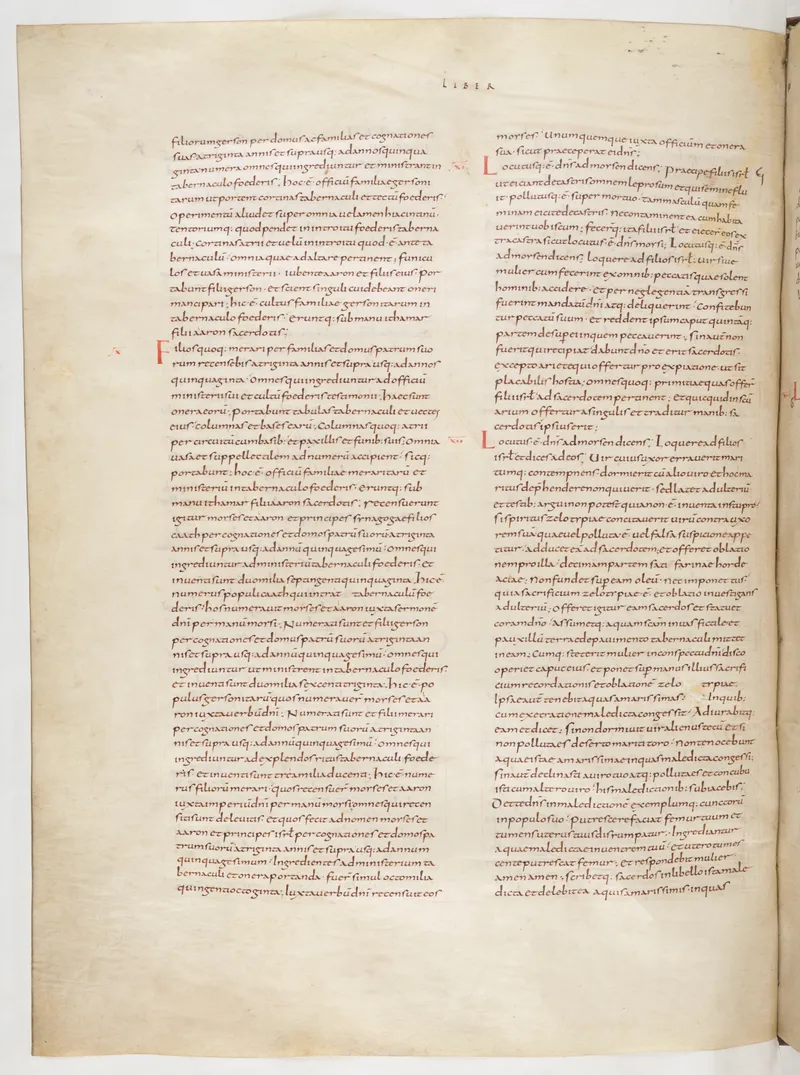 Folio 108 of the First Bible of Charles the Bald, an extant Carolingian Vulgate manuscript from the Tours scriptorium (c. 845). Approximately corresponds to Deuteronomy 6 in Vulgate book order. The folio shows the actual ninth-century Latin text and decoration as it would have been read in the Carolingian court.