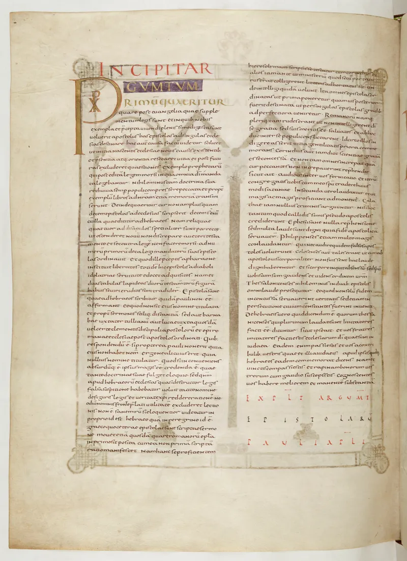 Folio 776 of the First Bible of Charles the Bald, an extant Carolingian Vulgate manuscript from the Tours scriptorium (c. 845). Approximately corresponds to Ephesians 5 in Vulgate book order. The folio shows the actual ninth-century Latin text and decoration as it would have been read in the Carolingian court.
