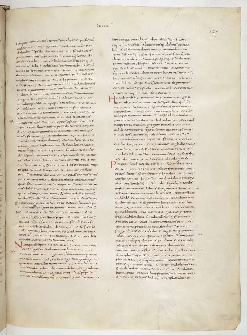 Folio 297 of the First Bible of Charles the Bald, an extant Carolingian Vulgate manuscript from the Tours scriptorium (c. 845). Approximately corresponds to Esther 9 in Vulgate book order. The folio shows the actual ninth-century Latin text and decoration as it would have been read in the Carolingian court.