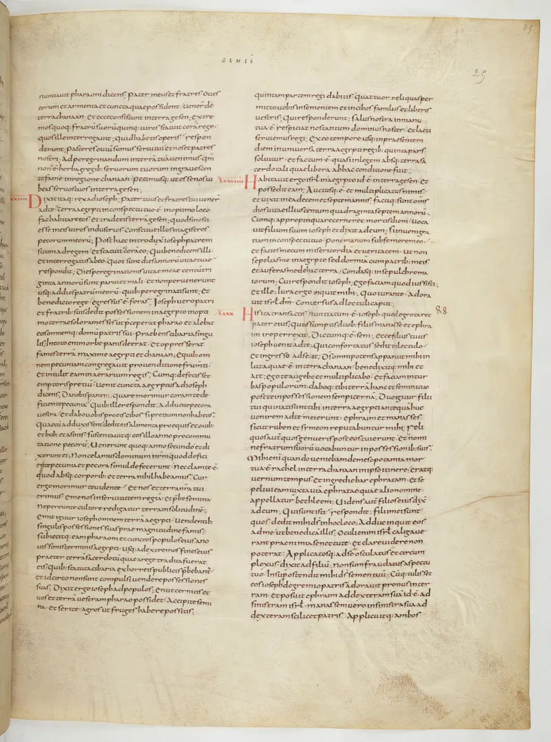 Folio 57 of the First Bible of Charles the Bald, an extant Carolingian Vulgate manuscript from the Tours scriptorium (c. 845). Approximately corresponds to Exodus 27 in Vulgate book order. The folio shows the actual ninth-century Latin text and decoration as it would have been read in the Carolingian court.
