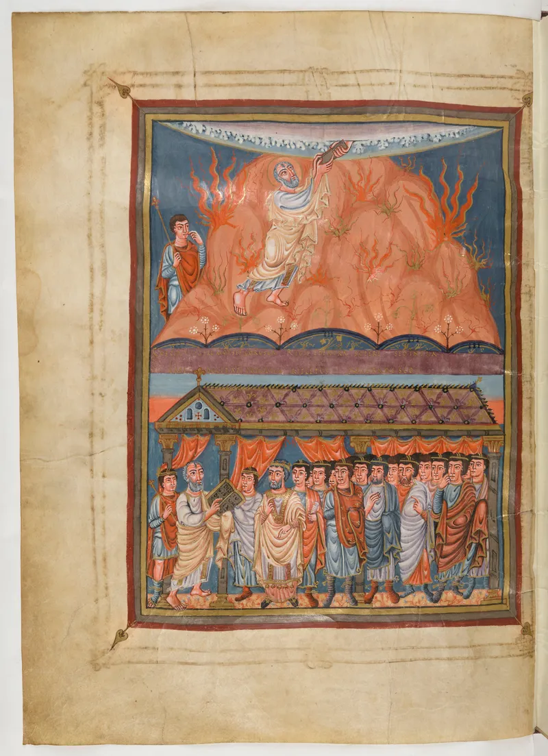 Folio 62 of the First Bible of Charles the Bald, an extant Carolingian Vulgate manuscript from the Tours scriptorium (c. 845). Approximately corresponds to Exodus 35 in Vulgate book order. The folio shows the actual ninth-century Latin text and decoration as it would have been read in the Carolingian court.