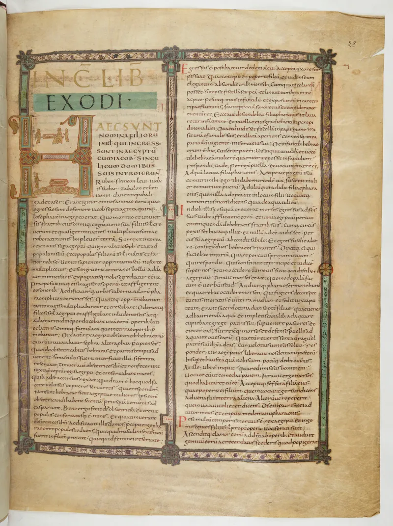 Folio 63 of the First Bible of Charles the Bald, an extant Carolingian Vulgate manuscript from the Tours scriptorium (c. 845). Approximately corresponds to Exodus 37 in Vulgate book order. The folio shows the actual ninth-century Latin text and decoration as it would have been read in the Carolingian court.