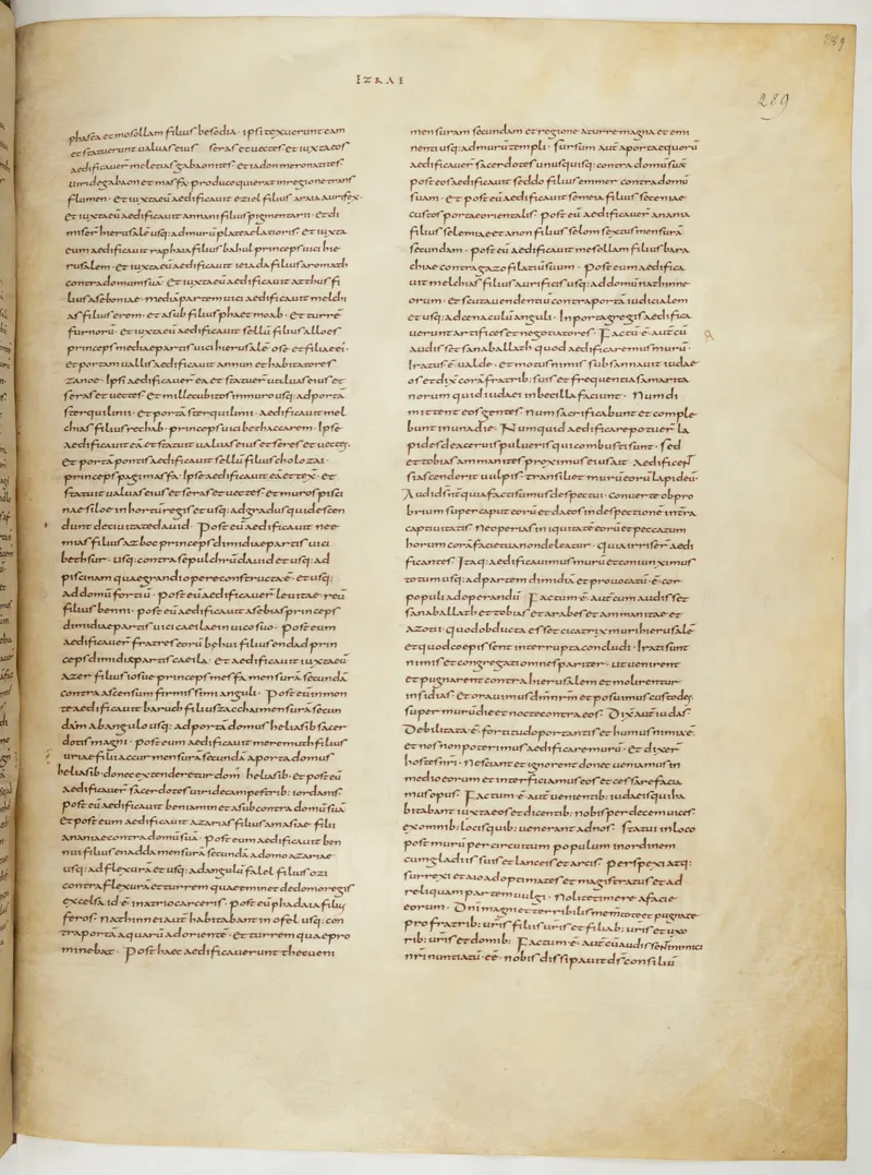 Folio 585 of the First Bible of Charles the Bald, an extant Carolingian Vulgate manuscript from the Tours scriptorium (c. 845). Approximately corresponds to Ezekiel 22 in Vulgate book order. The folio shows the actual ninth-century Latin text and decoration as it would have been read in the Carolingian court.