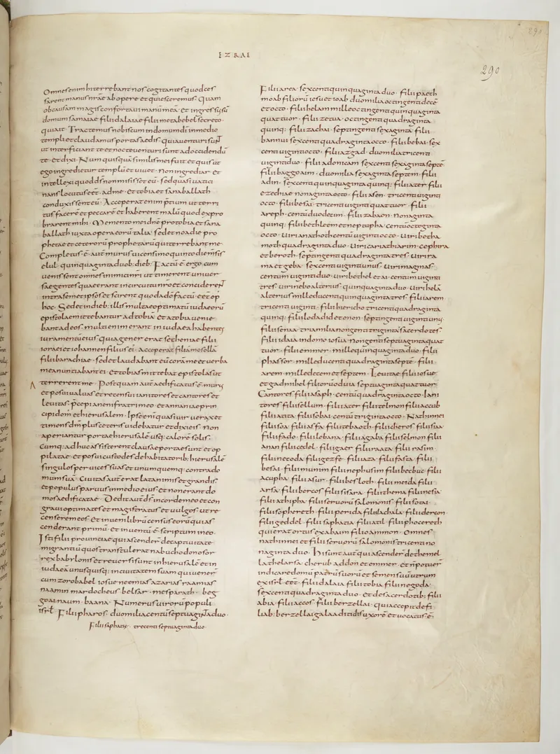 Folio 587 of the First Bible of Charles the Bald, an extant Carolingian Vulgate manuscript from the Tours scriptorium (c. 845). Approximately corresponds to Ezekiel 25 in Vulgate book order. The folio shows the actual ninth-century Latin text and decoration as it would have been read in the Carolingian court.