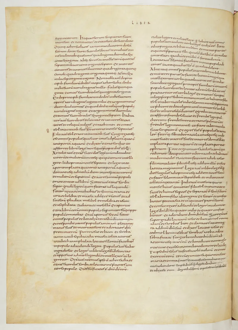 Folio 588 of the First Bible of Charles the Bald, an extant Carolingian Vulgate manuscript from the Tours scriptorium (c. 845). Approximately corresponds to Ezekiel 27 in Vulgate book order. The folio shows the actual ninth-century Latin text and decoration as it would have been read in the Carolingian court.