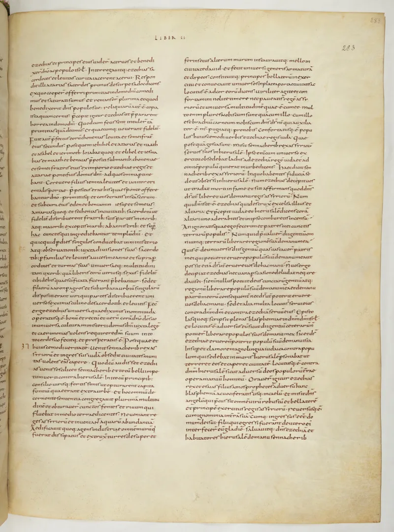 Folio 573 of the First Bible of Charles the Bald, an extant Carolingian Vulgate manuscript from the Tours scriptorium (c. 845). Approximately corresponds to Ezekiel 3 in Vulgate book order. The folio shows the actual ninth-century Latin text and decoration as it would have been read in the Carolingian court.