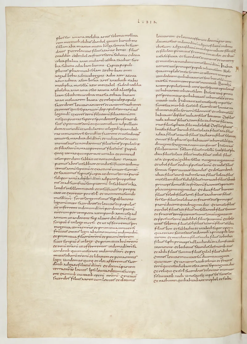 Folio 590 of the First Bible of Charles the Bald, an extant Carolingian Vulgate manuscript from the Tours scriptorium (c. 845). Approximately corresponds to Ezekiel 30 in Vulgate book order. The folio shows the actual ninth-century Latin text and decoration as it would have been read in the Carolingian court.