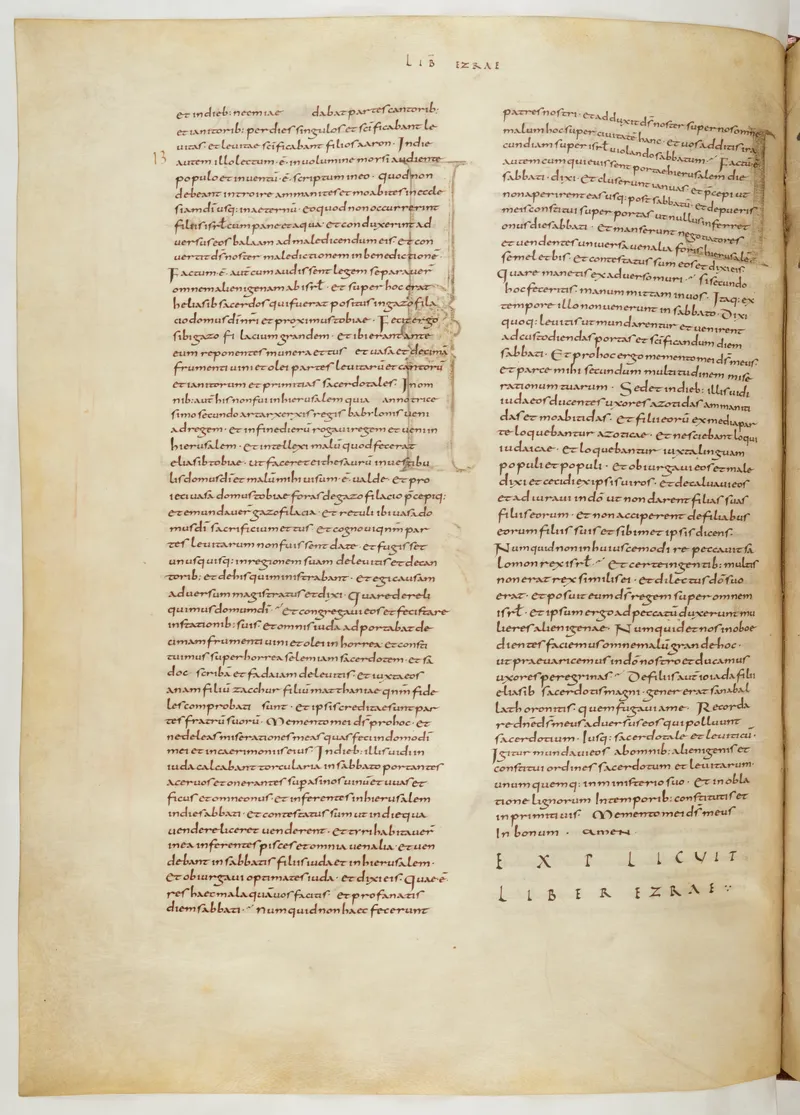 Folio 592 of the First Bible of Charles the Bald, an extant Carolingian Vulgate manuscript from the Tours scriptorium (c. 845). Approximately corresponds to Ezekiel 33 in Vulgate book order. The folio shows the actual ninth-century Latin text and decoration as it would have been read in the Carolingian court.