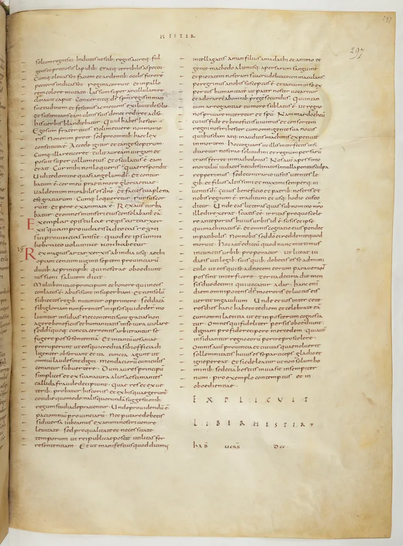 Folio 601 of the First Bible of Charles the Bald, an extant Carolingian Vulgate manuscript from the Tours scriptorium (c. 845). Approximately corresponds to Ezekiel 48 in Vulgate book order. The folio shows the actual ninth-century Latin text and decoration as it would have been read in the Carolingian court.