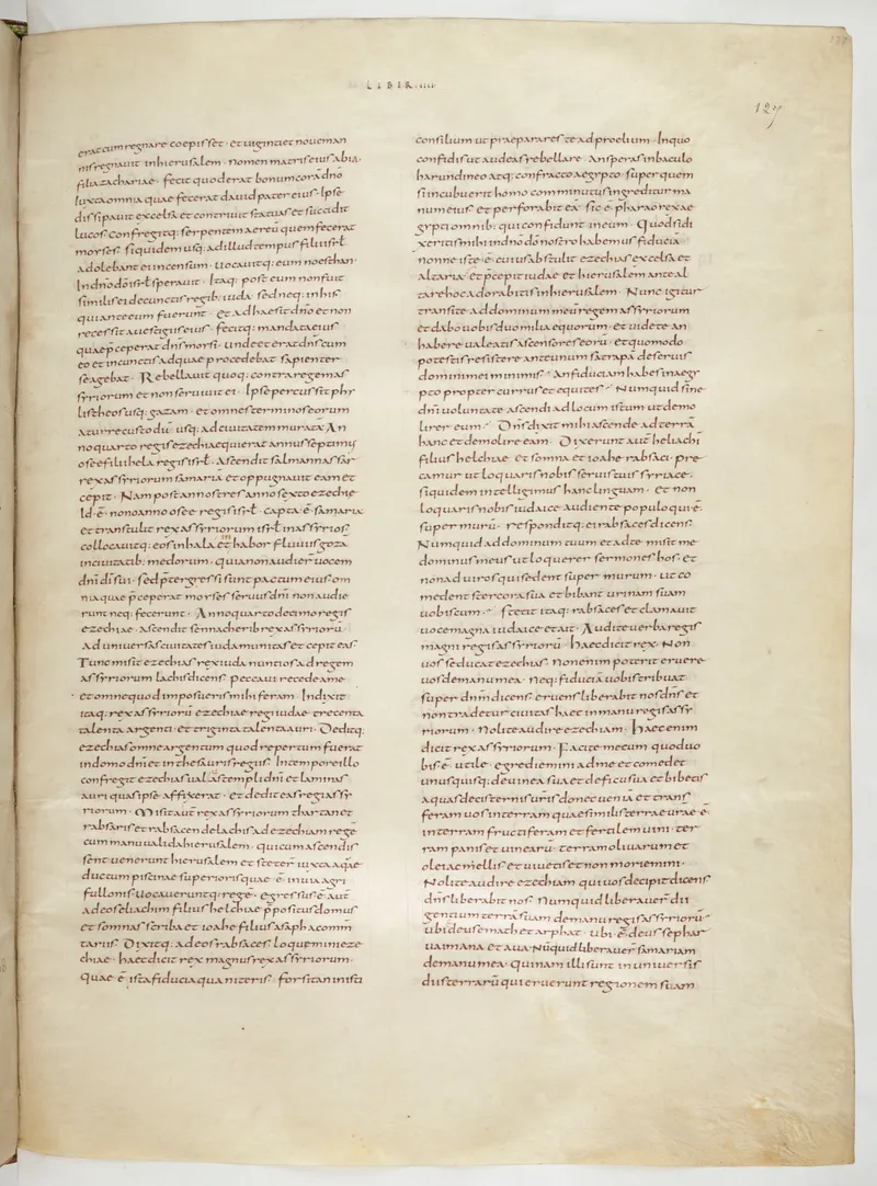 Folio 261 of the First Bible of Charles the Bald, an extant Carolingian Vulgate manuscript from the Tours scriptorium (c. 845). Approximately corresponds to Ezra 4 in Vulgate book order. The folio shows the actual ninth-century Latin text and decoration as it would have been read in the Carolingian court.