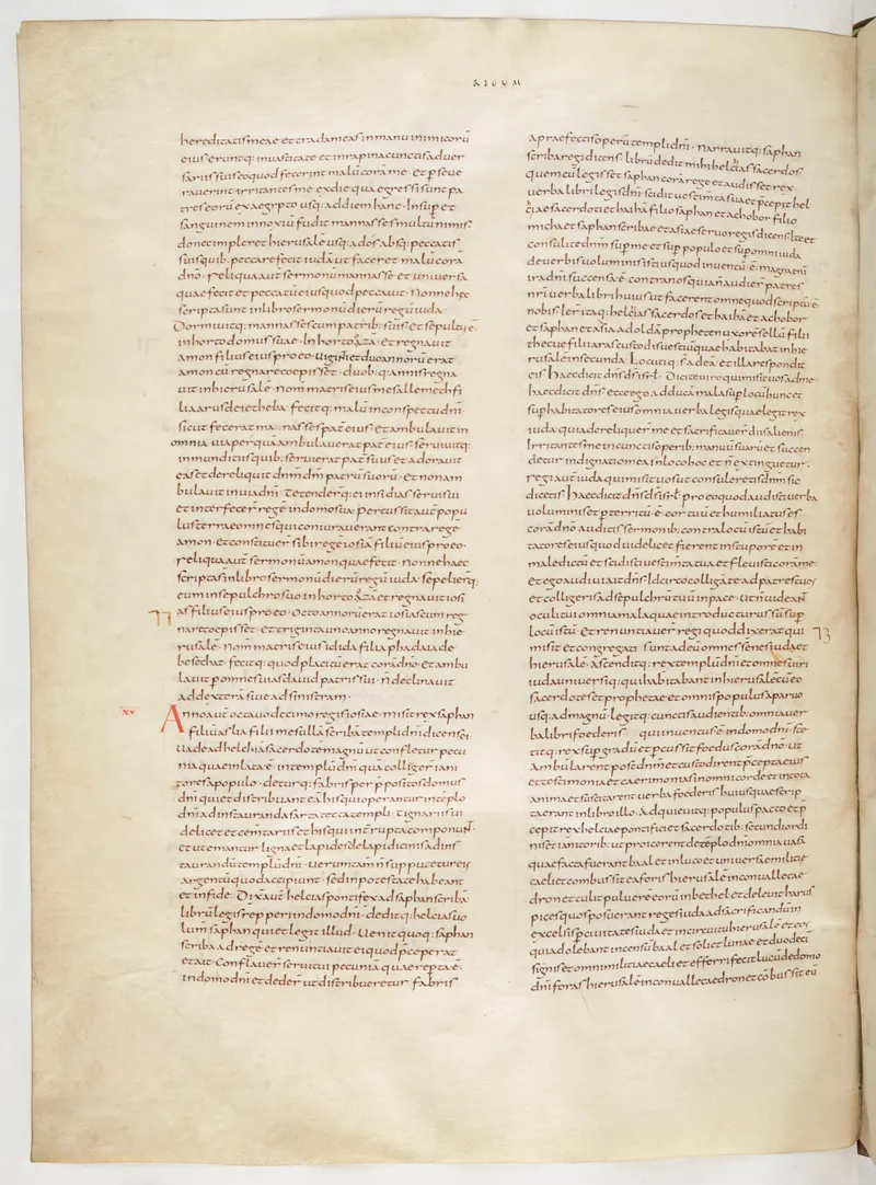 Folio 264 of the First Bible of Charles the Bald, an extant Carolingian Vulgate manuscript from the Tours scriptorium (c. 845). Approximately corresponds to Ezra 8 in Vulgate book order. The folio shows the actual ninth-century Latin text and decoration as it would have been read in the Carolingian court.
