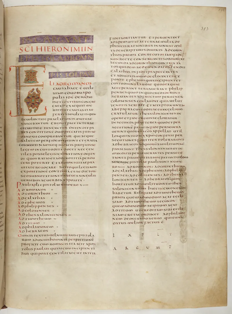Folio 773 of the First Bible of Charles the Bald, an extant Carolingian Vulgate manuscript from the Tours scriptorium (c. 845). Approximately corresponds to Galatians 6 in Vulgate book order. The folio shows the actual ninth-century Latin text and decoration as it would have been read in the Carolingian court.