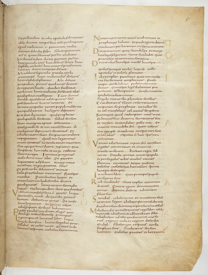 Folio 19 of the First Bible of Charles the Bald, an extant Carolingian Vulgate manuscript from the Tours scriptorium (c. 845). Approximately corresponds to Genesis 16 in Vulgate book order. The folio shows the actual ninth-century Latin text and decoration as it would have been read in the Carolingian court.