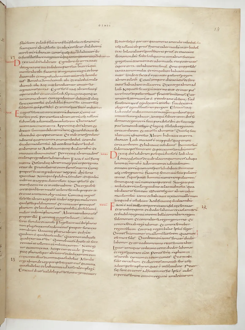 Folio 35 of the First Bible of Charles the Bald, an extant Carolingian Vulgate manuscript from the Tours scriptorium (c. 845). Approximately corresponds to Genesis 42 in Vulgate book order. The folio shows the actual ninth-century Latin text and decoration as it would have been read in the Carolingian court.