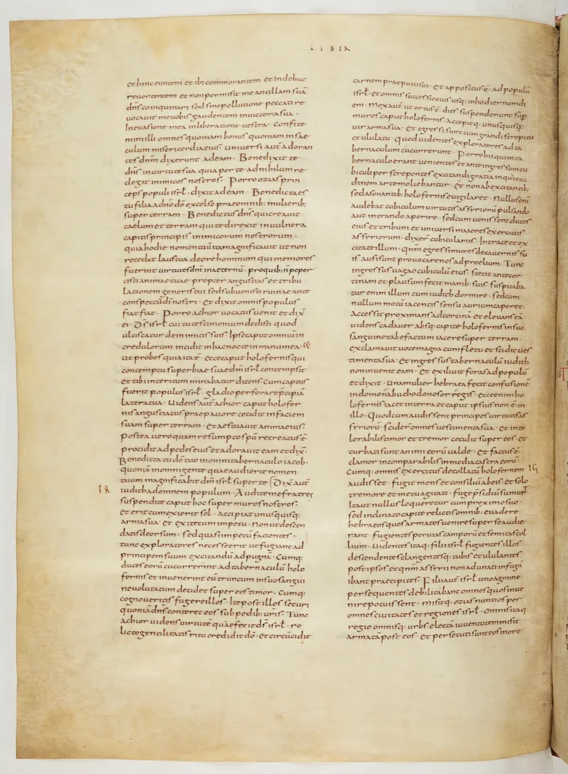 Folio 616 of the First Bible of Charles the Bald, an extant Carolingian Vulgate manuscript from the Tours scriptorium (c. 845). Approximately corresponds to Hosea 12 in Vulgate book order. The folio shows the actual ninth-century Latin text and decoration as it would have been read in the Carolingian court.