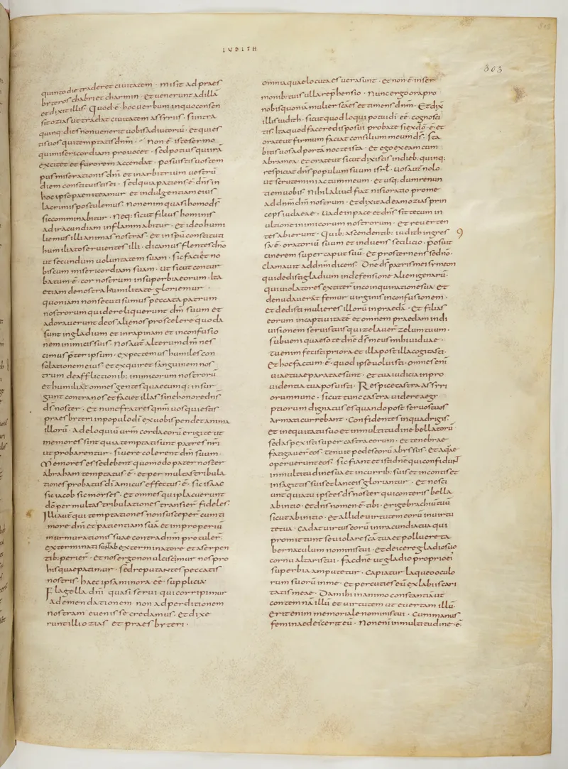 Folio 613 of the First Bible of Charles the Bald, an extant Carolingian Vulgate manuscript from the Tours scriptorium (c. 845). Approximately corresponds to Hosea 7 in Vulgate book order. The folio shows the actual ninth-century Latin text and decoration as it would have been read in the Carolingian court.