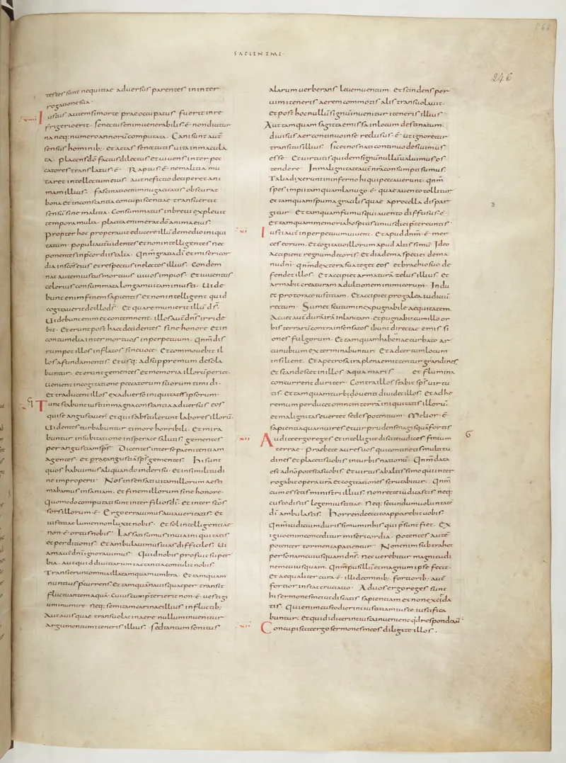 Folio 499 of the First Bible of Charles the Bald, an extant Carolingian Vulgate manuscript from the Tours scriptorium (c. 845). Approximately corresponds to Isaiah 12 in Vulgate book order. The folio shows the actual ninth-century Latin text and decoration as it would have been read in the Carolingian court.