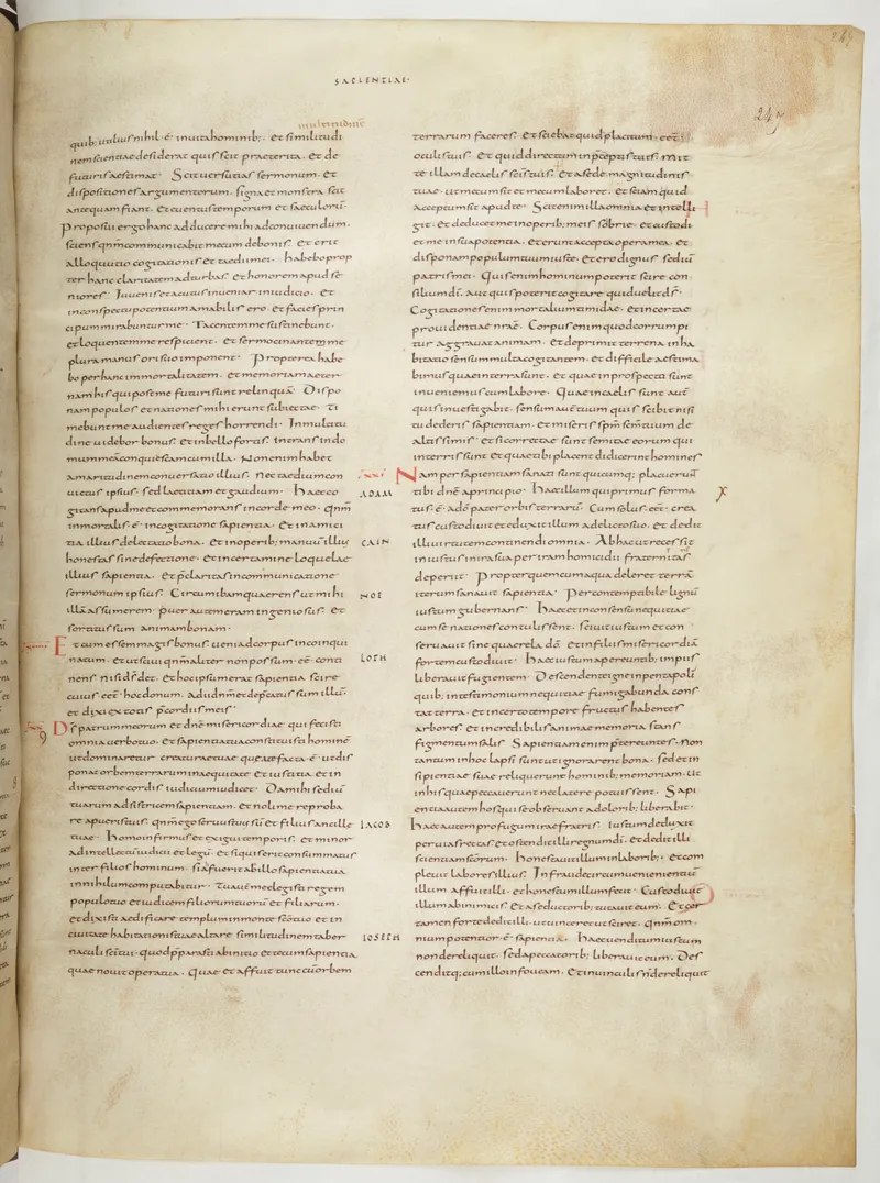 Folio 501 of the First Bible of Charles the Bald, an extant Carolingian Vulgate manuscript from the Tours scriptorium (c. 845). Approximately corresponds to Isaiah 16 in Vulgate book order. The folio shows the actual ninth-century Latin text and decoration as it would have been read in the Carolingian court.