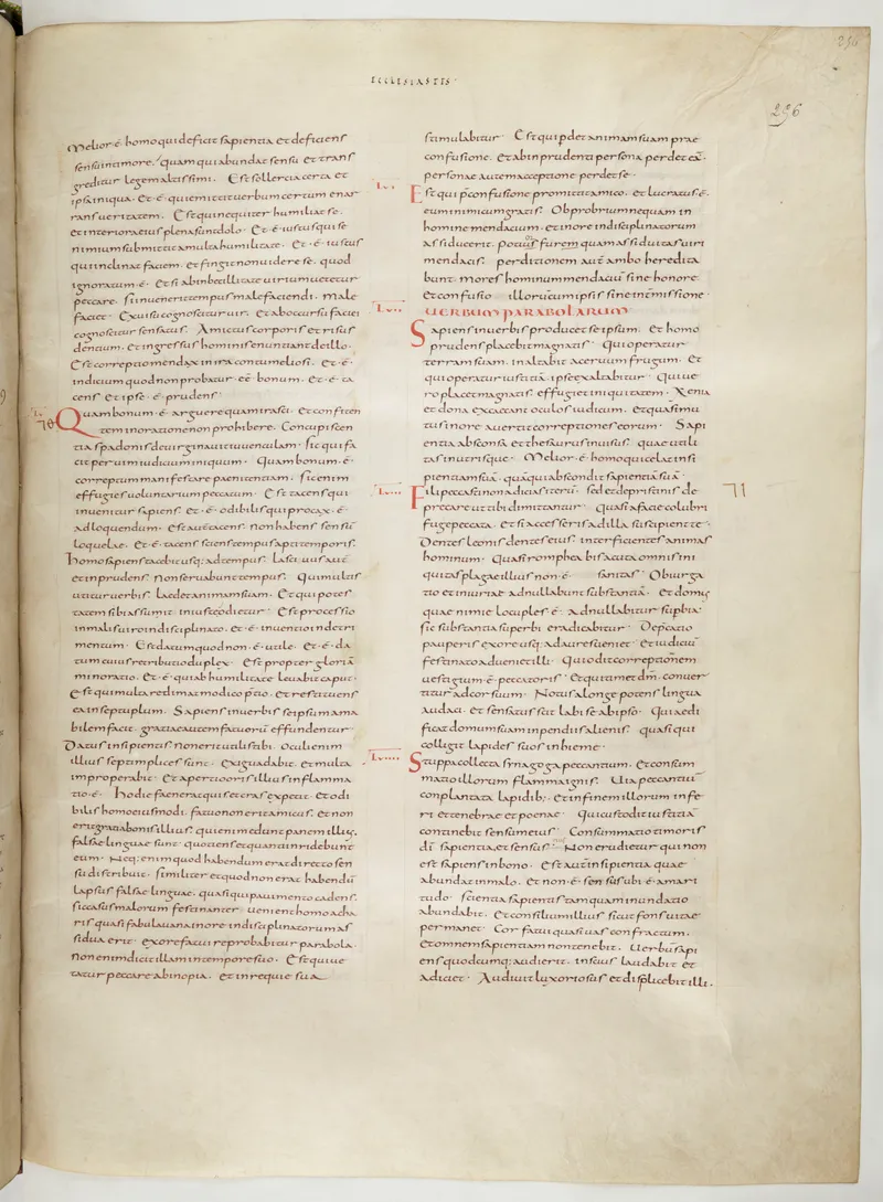 Folio 519 of the First Bible of Charles the Bald, an extant Carolingian Vulgate manuscript from the Tours scriptorium (c. 845). Approximately corresponds to Isaiah 45 in Vulgate book order. The folio shows the actual ninth-century Latin text and decoration as it would have been read in the Carolingian court.