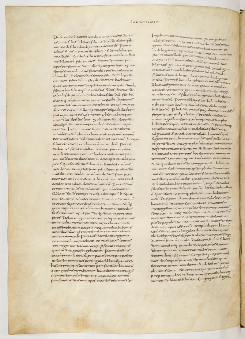 Folio 544 of the First Bible of Charles the Bald, an extant Carolingian Vulgate manuscript from the Tours scriptorium (c. 845). Approximately corresponds to Jeremiah 19 in Vulgate book order. The folio shows the actual ninth-century Latin text and decoration as it would have been read in the Carolingian court.