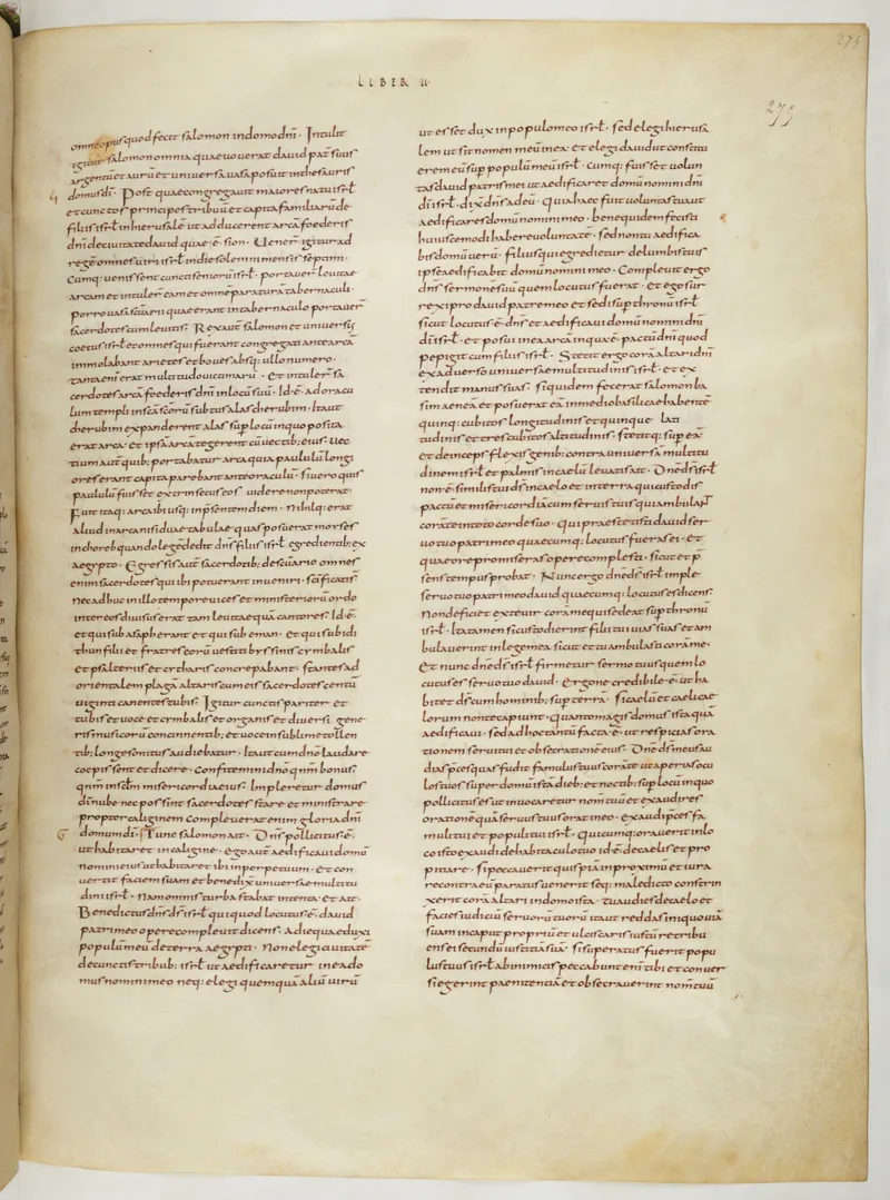 Folio 557 of the First Bible of Charles the Bald, an extant Carolingian Vulgate manuscript from the Tours scriptorium (c. 845). Approximately corresponds to Jeremiah 40 in Vulgate book order. The folio shows the actual ninth-century Latin text and decoration as it would have been read in the Carolingian court.