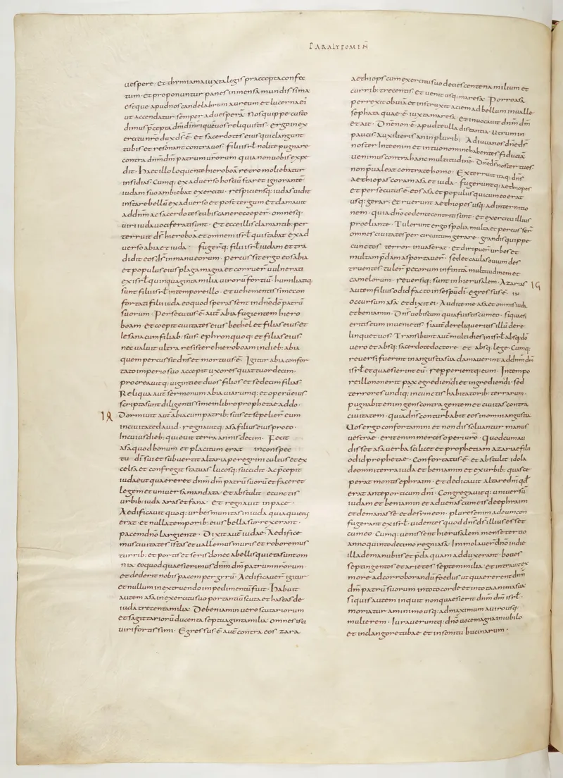 Folio 562 of the First Bible of Charles the Bald, an extant Carolingian Vulgate manuscript from the Tours scriptorium (c. 845). Approximately corresponds to Jeremiah 48 in Vulgate book order. The folio shows the actual ninth-century Latin text and decoration as it would have been read in the Carolingian court.