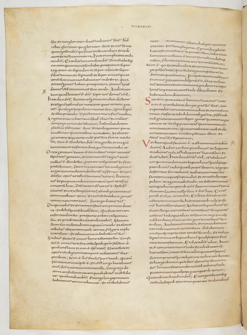 Folio 306 of the First Bible of Charles the Bald, an extant Carolingian Vulgate manuscript from the Tours scriptorium (c. 845). Approximately corresponds to Job 13 in Vulgate book order. The folio shows the actual ninth-century Latin text and decoration as it would have been read in the Carolingian court.