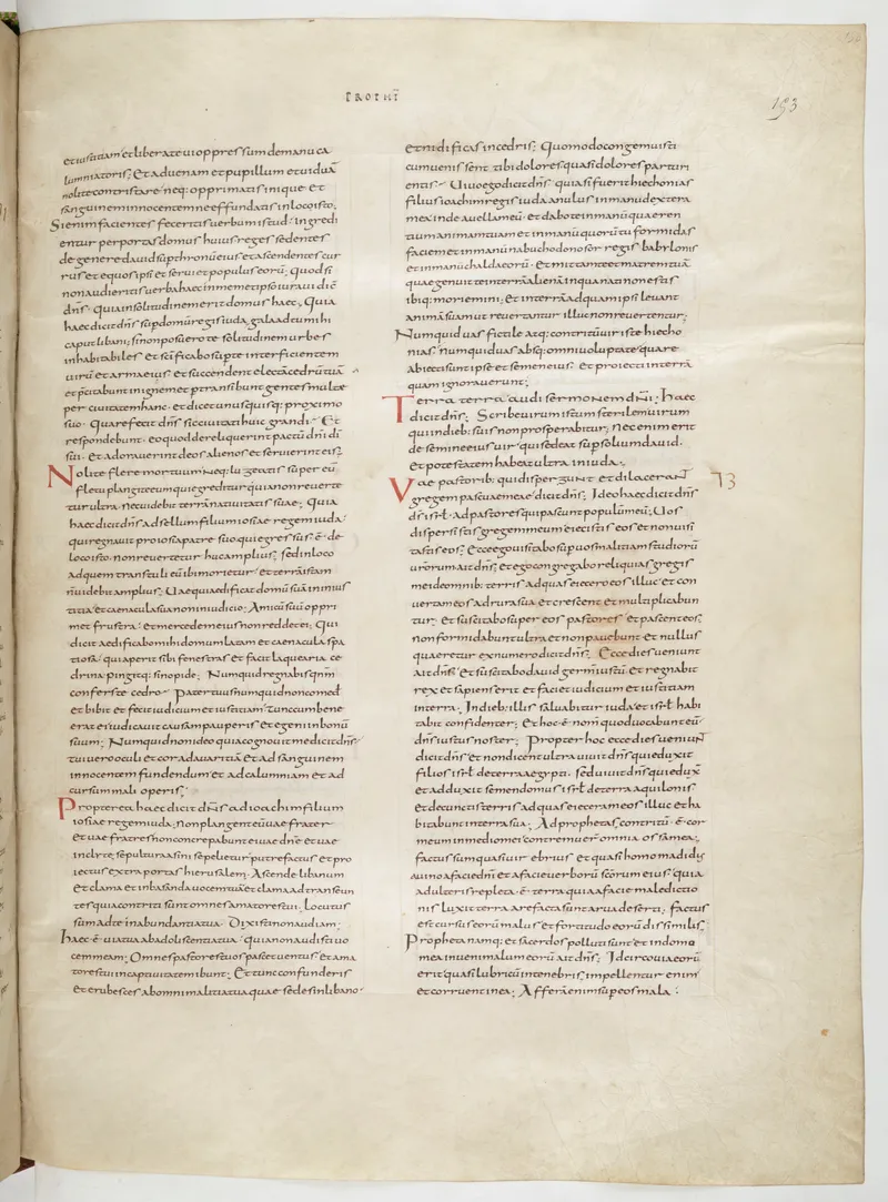 Folio 313 of the First Bible of Charles the Bald, an extant Carolingian Vulgate manuscript from the Tours scriptorium (c. 845). Approximately corresponds to Job 25 in Vulgate book order. The folio shows the actual ninth-century Latin text and decoration as it would have been read in the Carolingian court.