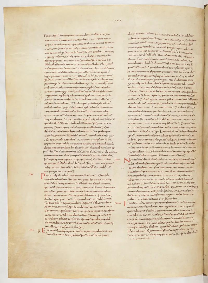 Folio 134 of the First Bible of Charles the Bald, an extant Carolingian Vulgate manuscript from the Tours scriptorium (c. 845). Approximately corresponds to Joshua 15 in Vulgate book order. The folio shows the actual ninth-century Latin text and decoration as it would have been read in the Carolingian court.