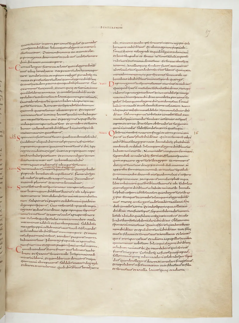 Folio 141 of the First Bible of Charles the Bald, an extant Carolingian Vulgate manuscript from the Tours scriptorium (c. 845). Approximately corresponds to Judges 1 in Vulgate book order. The folio shows the actual ninth-century Latin text and decoration as it would have been read in the Carolingian court.