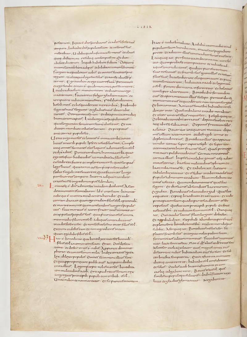 Folio 152 of the First Bible of Charles the Bald, an extant Carolingian Vulgate manuscript from the Tours scriptorium (c. 845). Approximately corresponds to Judges 20 in Vulgate book order. The folio shows the actual ninth-century Latin text and decoration as it would have been read in the Carolingian court.