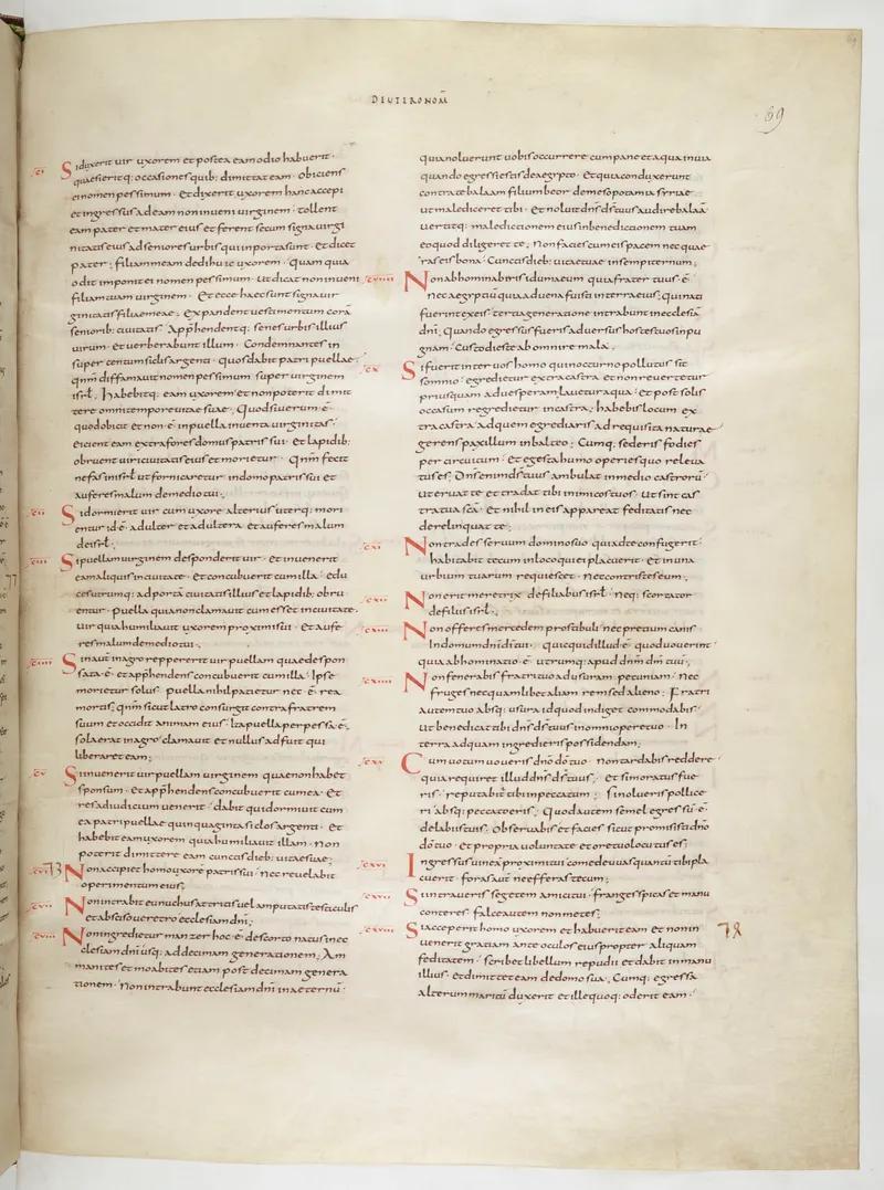 Folio 145 of the First Bible of Charles the Bald, an extant Carolingian Vulgate manuscript from the Tours scriptorium (c. 845). Approximately corresponds to Judges 8 in Vulgate book order. The folio shows the actual ninth-century Latin text and decoration as it would have been read in the Carolingian court.