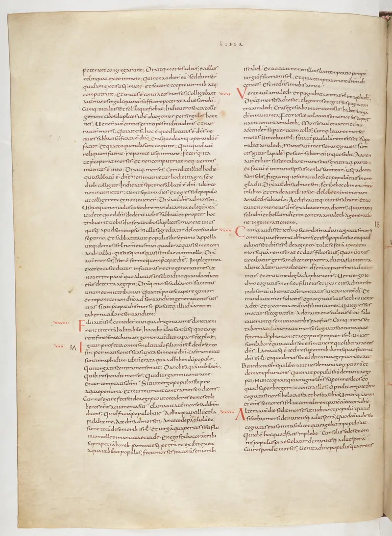 Folio 72 of the First Bible of Charles the Bald, an extant Carolingian Vulgate manuscript from the Tours scriptorium (c. 845). Approximately corresponds to Leviticus 11 in Vulgate book order. The folio shows the actual ninth-century Latin text and decoration as it would have been read in the Carolingian court.