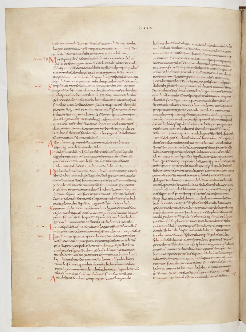 Folio 76 of the First Bible of Charles the Bald, an extant Carolingian Vulgate manuscript from the Tours scriptorium (c. 845). Approximately corresponds to Leviticus 18 in Vulgate book order. The folio shows the actual ninth-century Latin text and decoration as it would have been read in the Carolingian court.