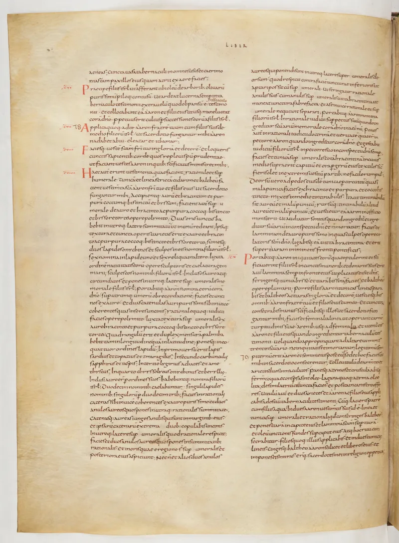 Folio 78 of the First Bible of Charles the Bald, an extant Carolingian Vulgate manuscript from the Tours scriptorium (c. 845). Approximately corresponds to Leviticus 21 in Vulgate book order. The folio shows the actual ninth-century Latin text and decoration as it would have been read in the Carolingian court.