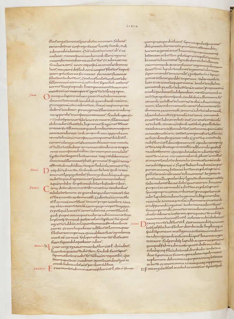 Folio 82 of the First Bible of Charles the Bald, an extant Carolingian Vulgate manuscript from the Tours scriptorium (c. 845). Approximately corresponds to Leviticus 27 in Vulgate book order. The folio shows the actual ninth-century Latin text and decoration as it would have been read in the Carolingian court.