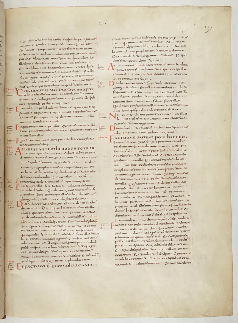 Folio 709 of the First Bible of Charles the Bald, an extant Carolingian Vulgate manuscript from the Tours scriptorium (c. 845). Approximately corresponds to Luke 20 in Vulgate book order. The folio shows the actual ninth-century Latin text and decoration as it would have been read in the Carolingian court.