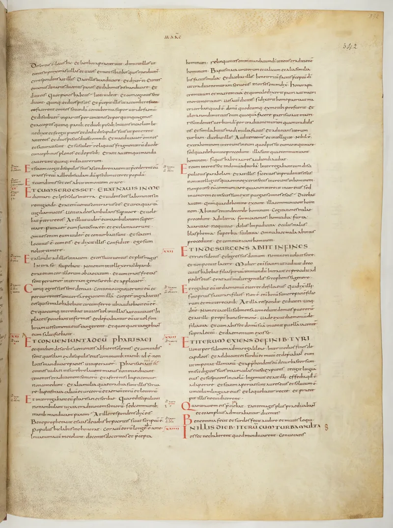 Folio 691 of the First Bible of Charles the Bald, an extant Carolingian Vulgate manuscript from the Tours scriptorium (c. 845). Approximately corresponds to Mark 8 in Vulgate book order. The folio shows the actual ninth-century Latin text and decoration as it would have been read in the Carolingian court.