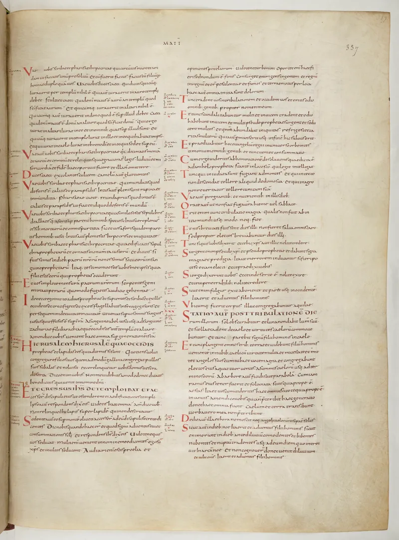 Folio 681 of the First Bible of Charles the Bald, an extant Carolingian Vulgate manuscript from the Tours scriptorium (c. 845). Approximately corresponds to Matthew 20 in Vulgate book order. The folio shows the actual ninth-century Latin text and decoration as it would have been read in the Carolingian court.