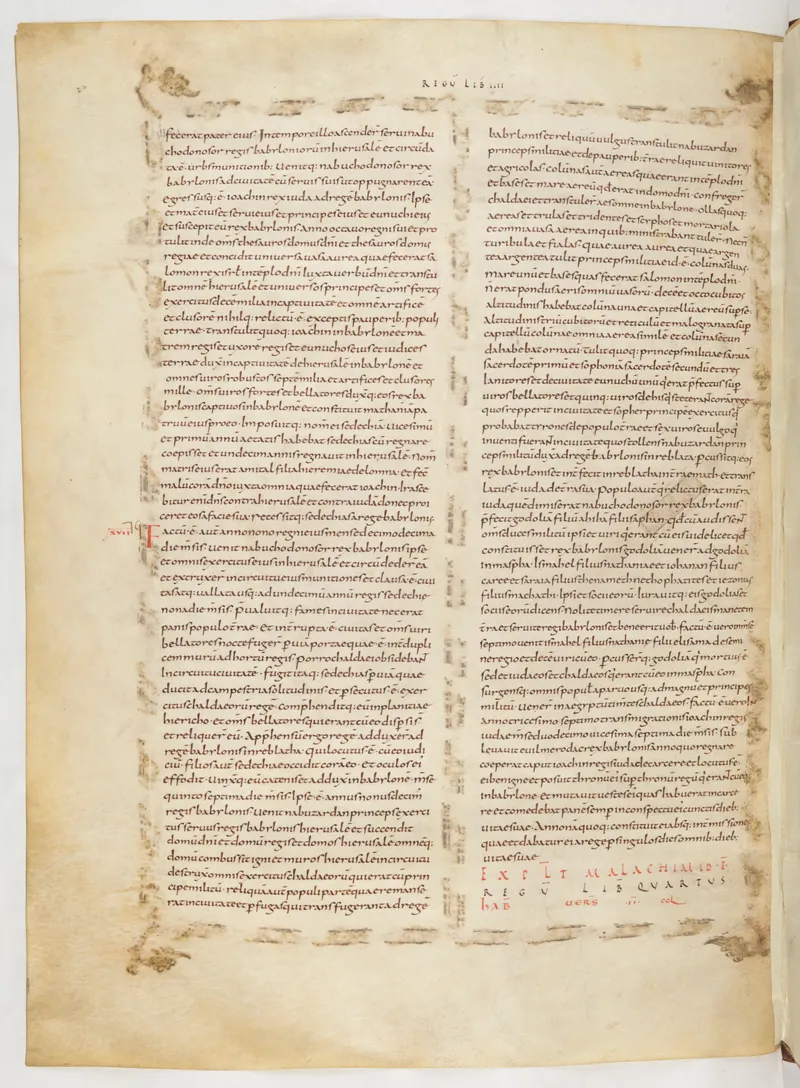 Folio 266 of the First Bible of Charles the Bald, an extant Carolingian Vulgate manuscript from the Tours scriptorium (c. 845). Approximately corresponds to Nehemiah 1 in Vulgate book order. The folio shows the actual ninth-century Latin text and decoration as it would have been read in the Carolingian court.