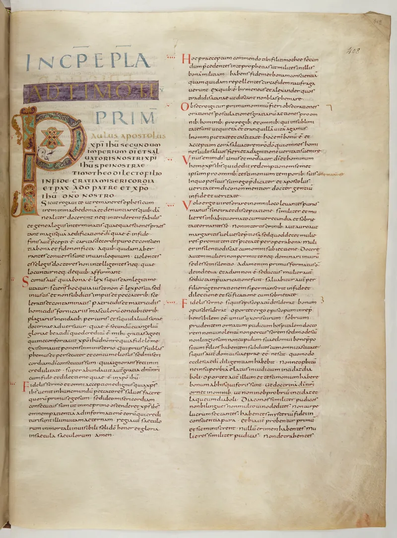 Folio 823 of the First Bible of Charles the Bald, an extant Carolingian Vulgate manuscript from the Tours scriptorium (c. 845). Approximately corresponds to Revelation 11 in Vulgate book order. The folio shows the actual ninth-century Latin text and decoration as it would have been read in the Carolingian court.